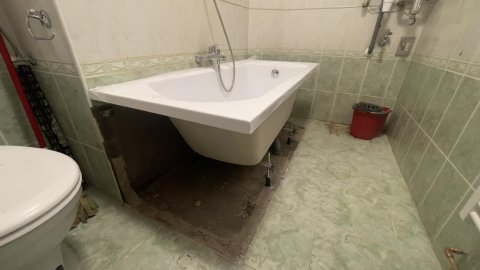 A kádat is lecseréltük, mert „furcsa szagot” éreztek. A kád kibontása után láttuk a furcsa szag eredetét, a meglévő szennyvízcső szét volt válva. A kádat a beállítottuk, bekötöttünk, szagokat elhárítottuk és mindenki elégedetten távozott.