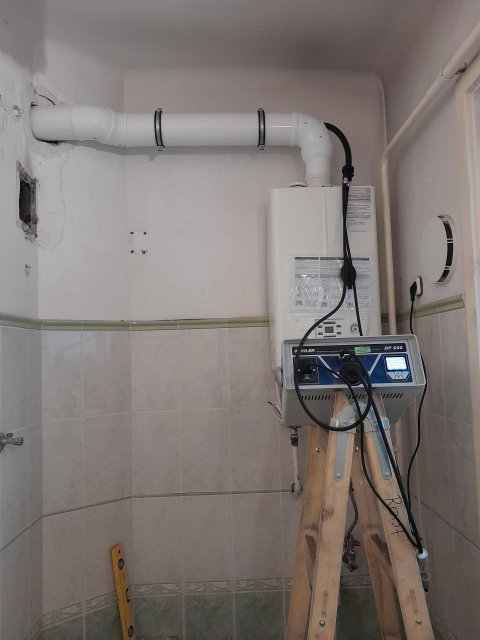 A megrendelőnek egy sima fűtő kazánja volt, amivel csak a fűtést tudja ellátni. A melegvizet egy elektromos bojler végezte, ami ugyan abba a helyiségben volt. Egy kombi kondenzációs kazánra szerette volna lecserélni, mivel az elektromos bojlerek sokat fogyasztanak. Egyszerűsített kazáncsere keretein belül, le is cseréltük a készülékét egy Immergas kombi kazánra, ami jelenleg a legjobb árérték aránnyal bír a piacon. Az elektromos bojlerét megszüntettük és a használati melegvíz előre és visszatérő ágát, falon kívül megszerelve, réz presses szereléssel, elvittük az új kondenzációs kazánhoz. Mivel vizes helyiségben voltunk, ezért a kondenzvíz elvezetését könnyedén meg tudtuk oldani, a mosógép elvezetése lett meghosszabbítva, és egy légbeszívóval ellátott poharas csepptálcába lett elvezetve a kondenzvíz. Kazáncsere folyamán az elektromos szerelést sem lehet figyelmen kívül hagyni, meg kell győződni, hogy van-e 30mA-es fírelé a hálózaton, mivel csak ebben az esetben lehet konnektorba dugni a készüléket. Hogyha nincs akkor egy kismegszakító dobozt kell telepíteni s abba belekötni közvetlen a kazánt. A készülék garanciális beüzemelését is mi végezzük, ehhez hozzá tartozik a füstgáz / levegő mérése, kielemzése, valamint a beüzemelő a megrendelőnek mindent elmond a készülékről, hogy hogyan működik, mit lehet rajta állítani.