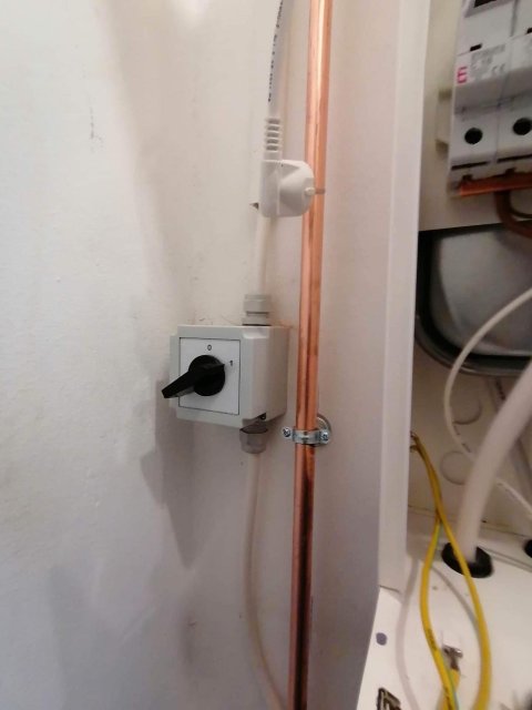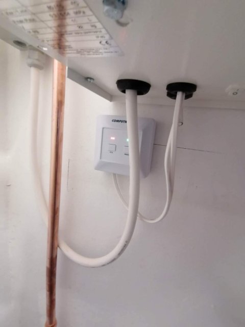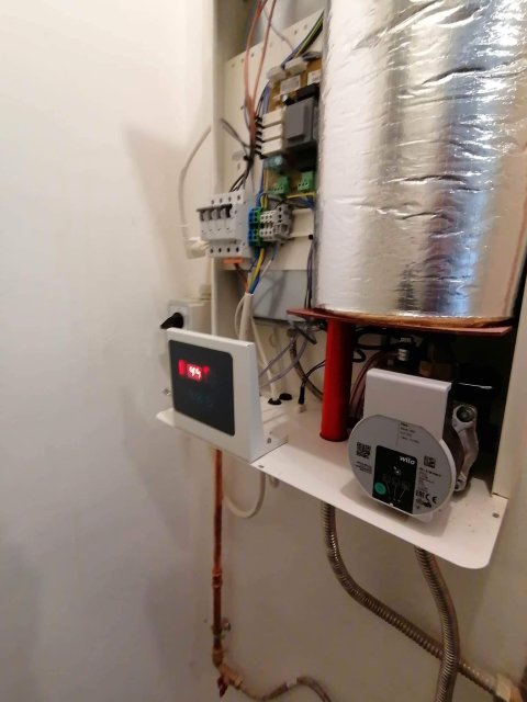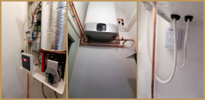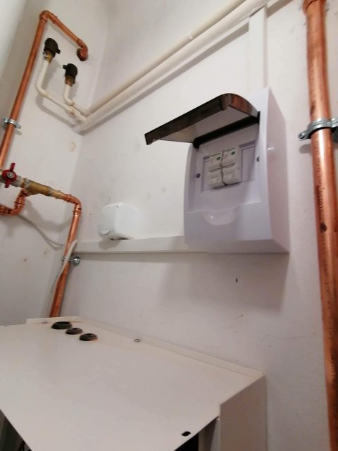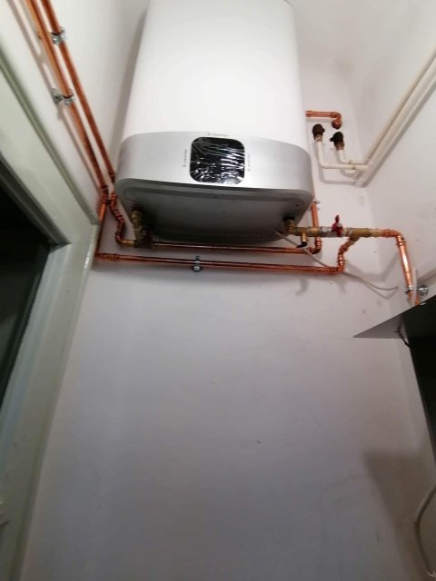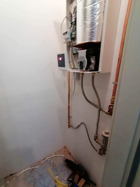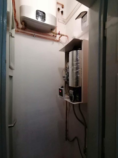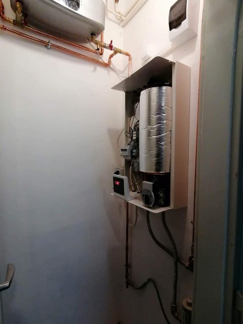 A meglévő / megmaradó kazánnál megbontottuk a fűtés csöveket és egy T elágazással, falon kívül szerelve rézzel elvittük a használati melegvíz vezetékeit az elektromos bojlerhez, amit helytakarékosság céljából egy kis spájzba telepítettünk. Az elektromos kazán is ebbe a kis helység másik falán tökéletesen elfért. Az elektromos kazánhoz a fűtési csöveket a fölötte lévő fűtési gerincvezetékből tudtuk kiváltani és kiépíteni a kazánoz. Mivel nem nyúltunk a gázkazánhoz, és az új telepítésű kazán elektromos, ezért ez nem egy egyszerűsített kazáncsere, nincs lejelentési kötelezettsége a gázművek irányába.